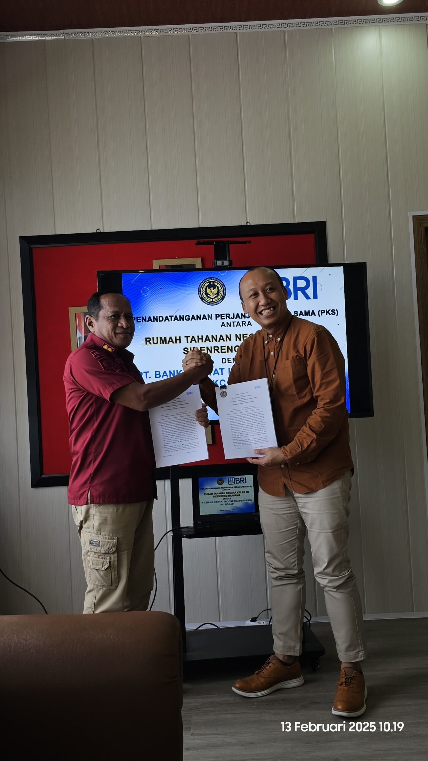 PKS ditandatangani langsung oleh Kepala Rutan Kelas IIB Sidenreng Rappang, Muhammad Syahrir Azis, S.E., S.H., M.Si, dan Branch Office Head BRI Sidrap, Sudadi. Penandatanganan disaksikan oleh staf BRI Sidrap.