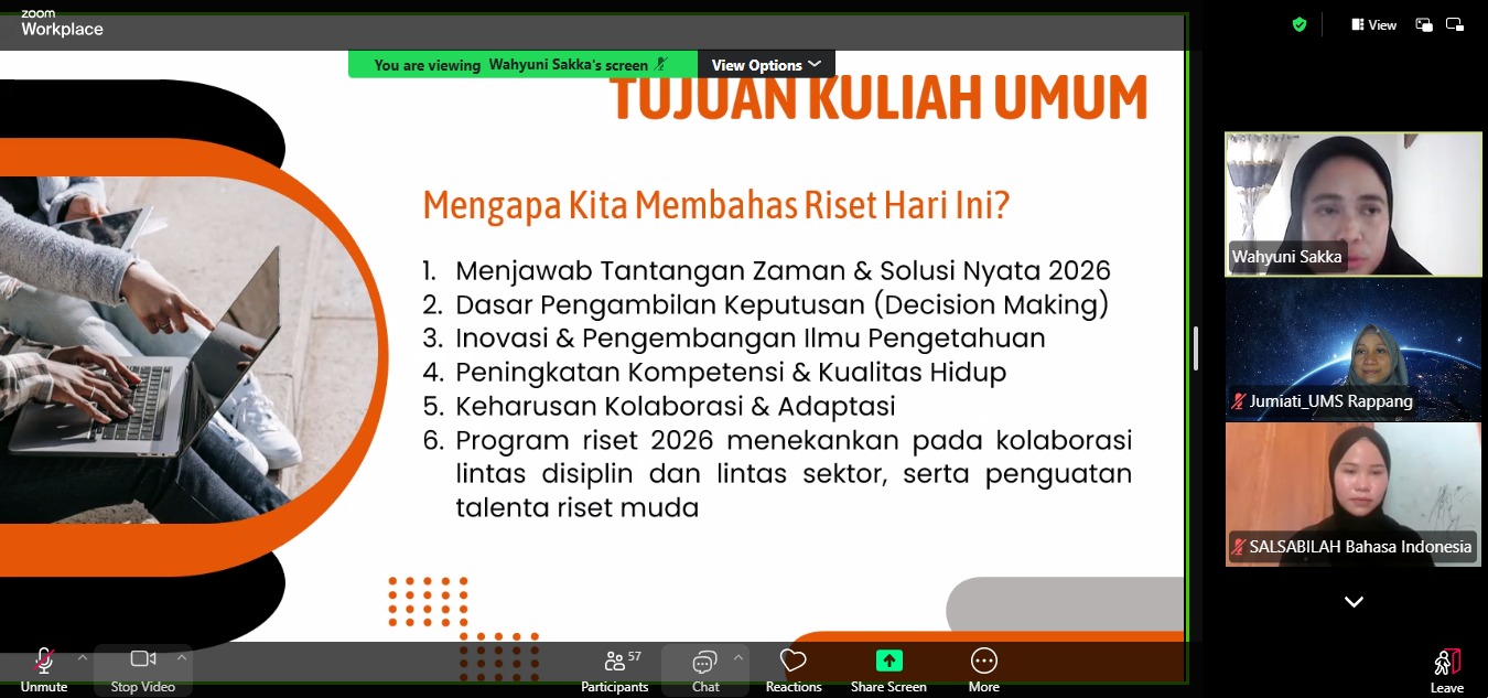Kuliah umum yang dilaksanakan secara daring tersebut menghadirkan narasumber Dr. Wahyuni, S.Pd.I., M. Pd yang memaparkan pentingnya membangun pola pikir ilmiah, mulai dari kemampuan mengidentifikasi masalah, menyusun proposal penelitian, hingga mempublikasikan hasil riset di jurnal ilmiah.